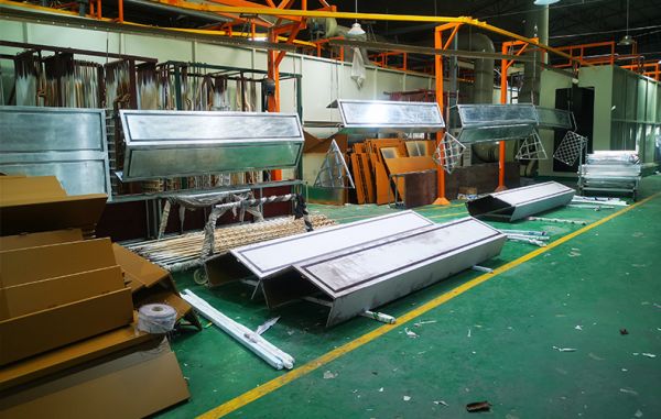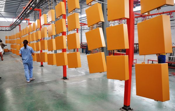 德国进口的全长250米的全自动喷涂生产线,以及木纹转印车间。