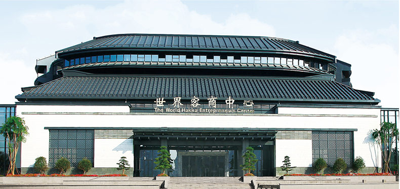 世界客商中心位于广东梅州市梅江区芹洋半岛品牌战略发展区,由中国工程院院士、岭南建筑大师、华南理工大学何镜堂教授领衔设计。以传统客家围屋意象为出发点,以“聚”字为设计创意,四方汇聚,蕴含四海客商相聚之意。中心设计楼高5层,采用现代经典建筑对称布局,建筑典雅、稳重、大气。中心内设会展、餐饮等四大功能区。