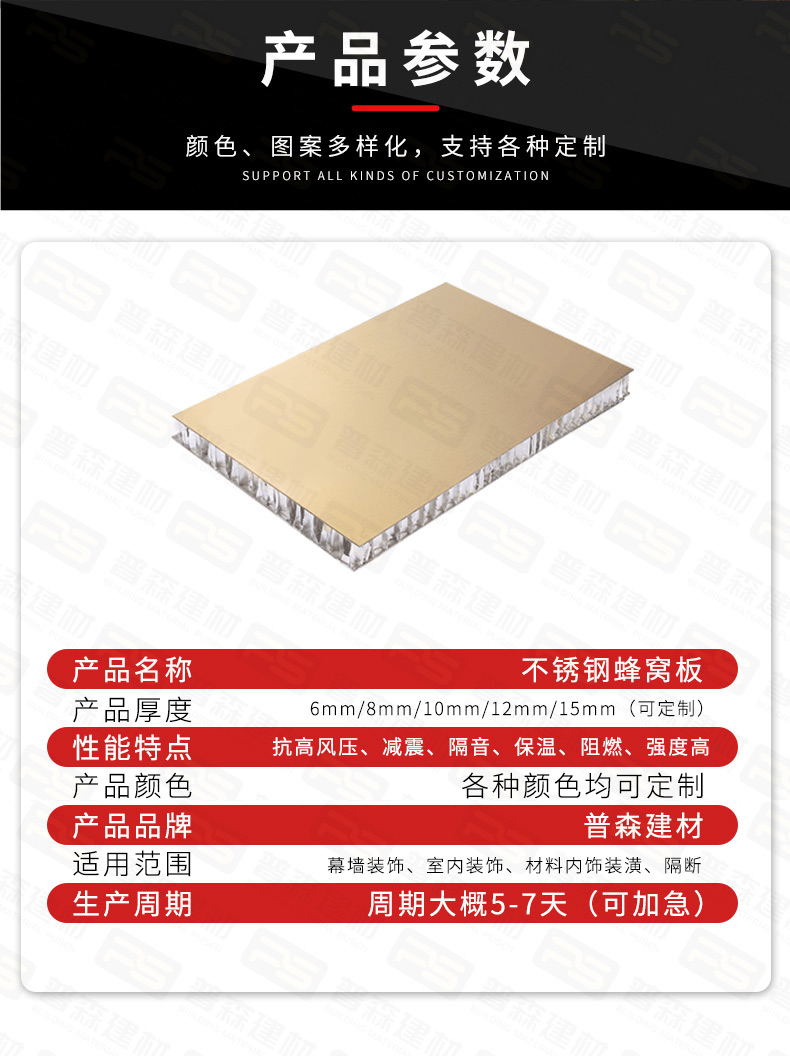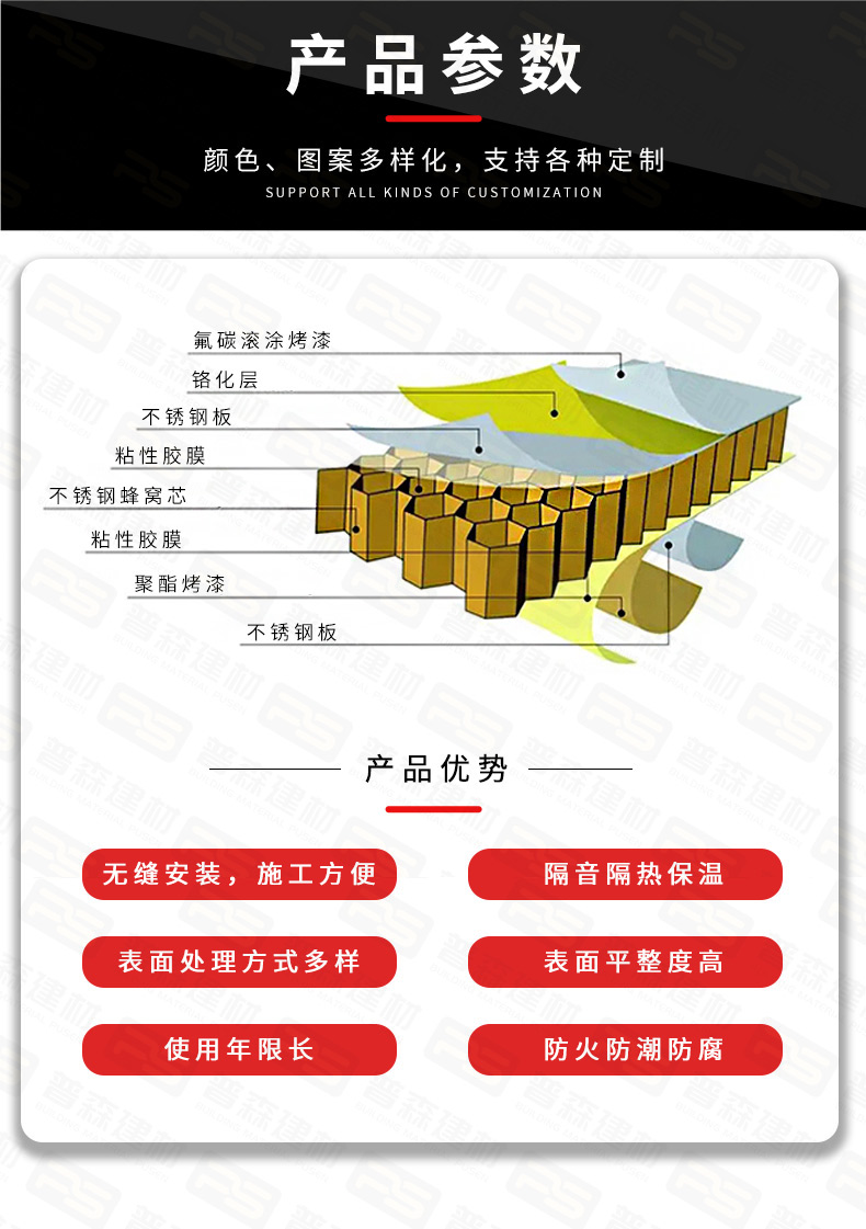 产品结构:不锈钢板+铝蜂窝芯+镀锌底板(铝板)